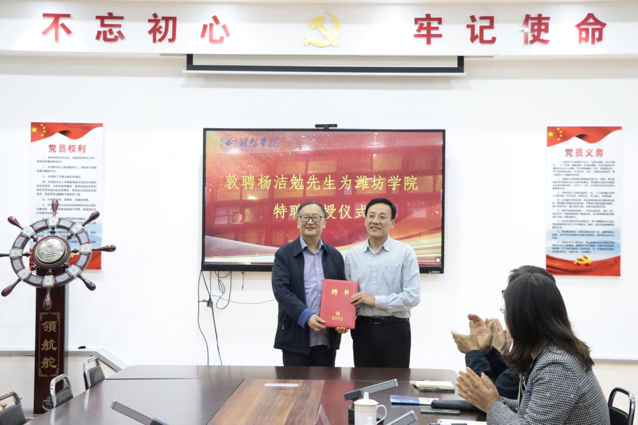 2025年10月14日下午,潍坊学院隆重举行敦聘杨洁勉先生为特聘教授仪式暨学术报告会。我校党委书记来逢波教授出席仪式并为杨洁勉先生颁发聘书。聘任仪式和报告会由党委委员、副校长苗金春主持,潍坊市外事办卢杰主任,潍坊学院发展规划与学...