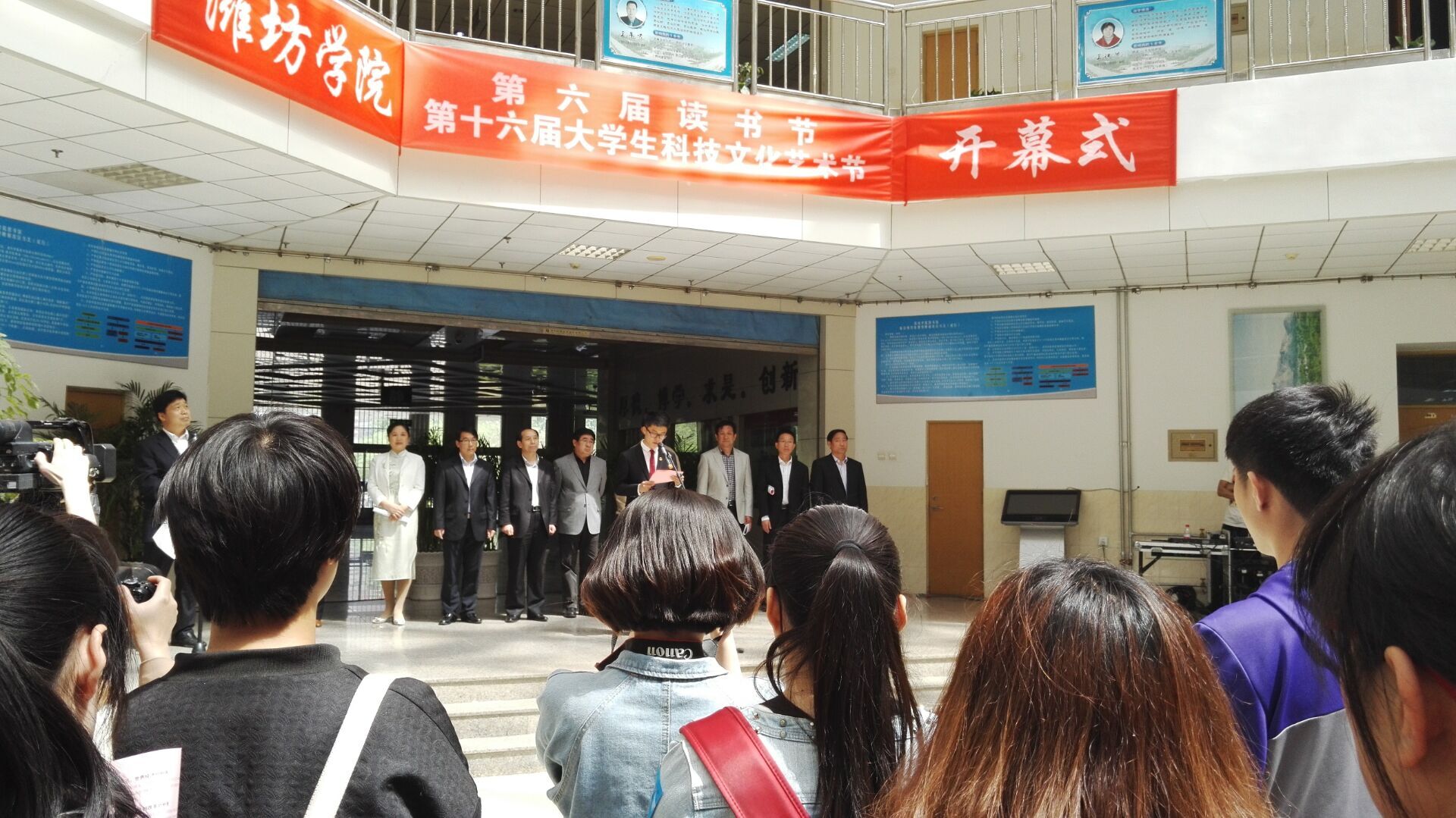第六届读书节第十六届大学生科技文化艺术节于2016年4月22日星期日10:30在图书馆一楼大厅举行。莅临本次开幕式的领导有潍坊学院党委书记孙文亮同志,潍坊学院校长冯滨鲁同志,潍坊学院副校长丁子信同志等。参加开幕式的还有各位媒体朋友、潍坊学院各部门负责人和学生代表。经济管理学院的学生也积极的参加的本次活动中去。会议开始首先有请潍坊学院校长冯滨鲁同志讲话,然后是潍坊学院图书馆馆长侯麓同志介绍第六届图书节有关活动情况,其次是潍坊学院团委书记张晓静同志介绍第十六届大学生科技文化艺术节有关活动情况,最后是学生代表孙涛同学发言。主持人致谢幕词,开幕式圆满结束。开幕式结束后大家参观了“故乡勿忘我”——刘铁飞油画展和“抗日烽火”——蔚世海门券收藏展。