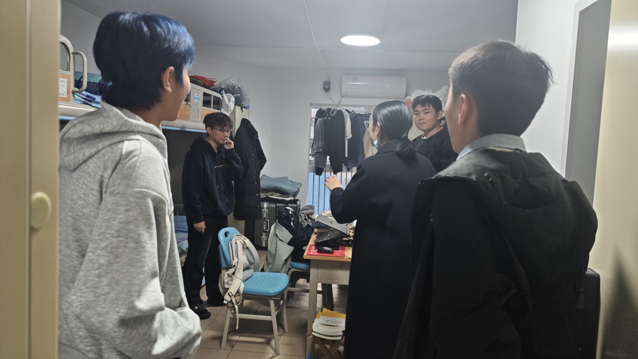 在检查过程中,焦祥嘉和聂国峰深入各宿舍,逐一对每间宿舍进行细致检查。从电路安全是否达标、地面及公共区域是否洁净,到被褥叠放是否整齐、物品摆放是否有序,宿舍内是否存在违规电器等方面进行仔细查看。 检查过程中,不仅耐心查看每一项内容,还结合实际情况对同学们细致叮嘱,反复强调安全用电与保持卫生的重要性;对于检查中发现的物品摆放杂乱、插座使用不规范等细节问题,更是当场与宿舍成员沟通,清晰明确地提出具体整改建议,指导大家及时优化调整,切实将宿舍管理的要求落到实处。