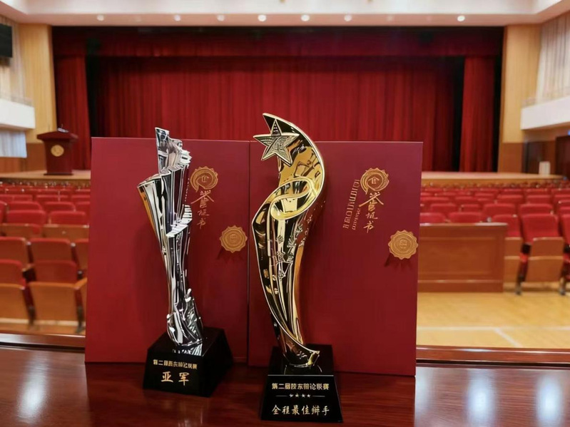 在正赛比赛中,潍坊学院辩论队展现出了高超的辩论理解和卓越的竞技水平。我校辩论队连续击败了山东科技大学和青岛港湾职业技术学院等传统强队,展现出了不畏强手、敢于拼搏的精神风貌。在最后的总决赛舞台上,潍坊学院辩论队与山东大学代表队展开了一场精彩绝伦的辩论交锋。双方你来我往,妙语连珠,最终我校以7:8的比分,仅以一票之差惜败山东大学,荣膺「2025年华语辩论世界杯青岛赛区亚军」。同时,我校雷彦淳辩手还荣获了「全程最佳辩手」的个人最高荣誉。