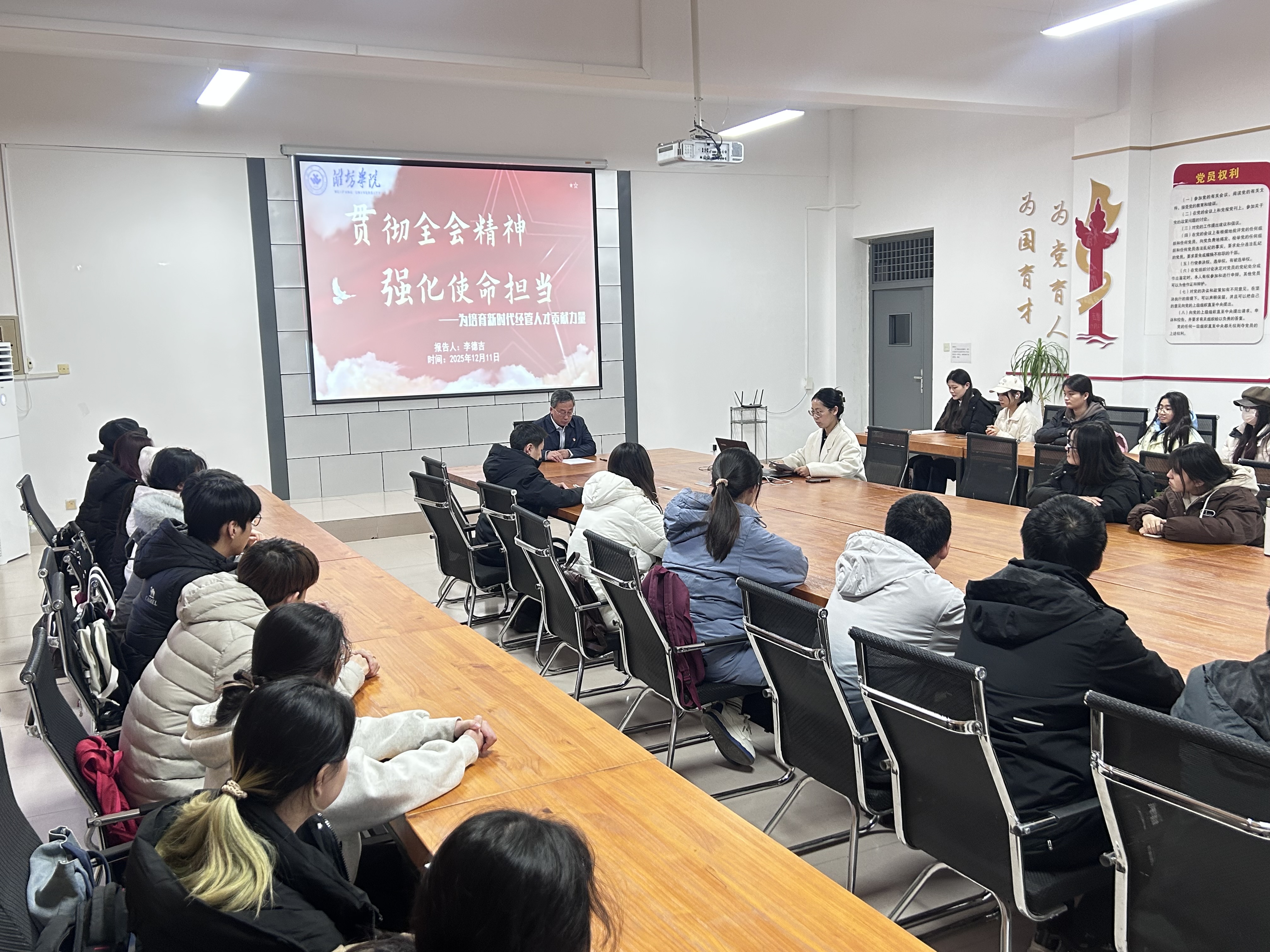 为深入领会国家发展战略,明晰时代使命,经济管理学院于12月11日在致远楼409会议室举办“贯彻全会精神,强化使命担当”——党的二十届四中全会精神“书记第一讲”活动。学院党委书记李德吉担任主讲,团委负责人聂国峰,辅导员杜泊明、郭华盈、刘佳及2025级会计学本科一班部分同学共同参与。