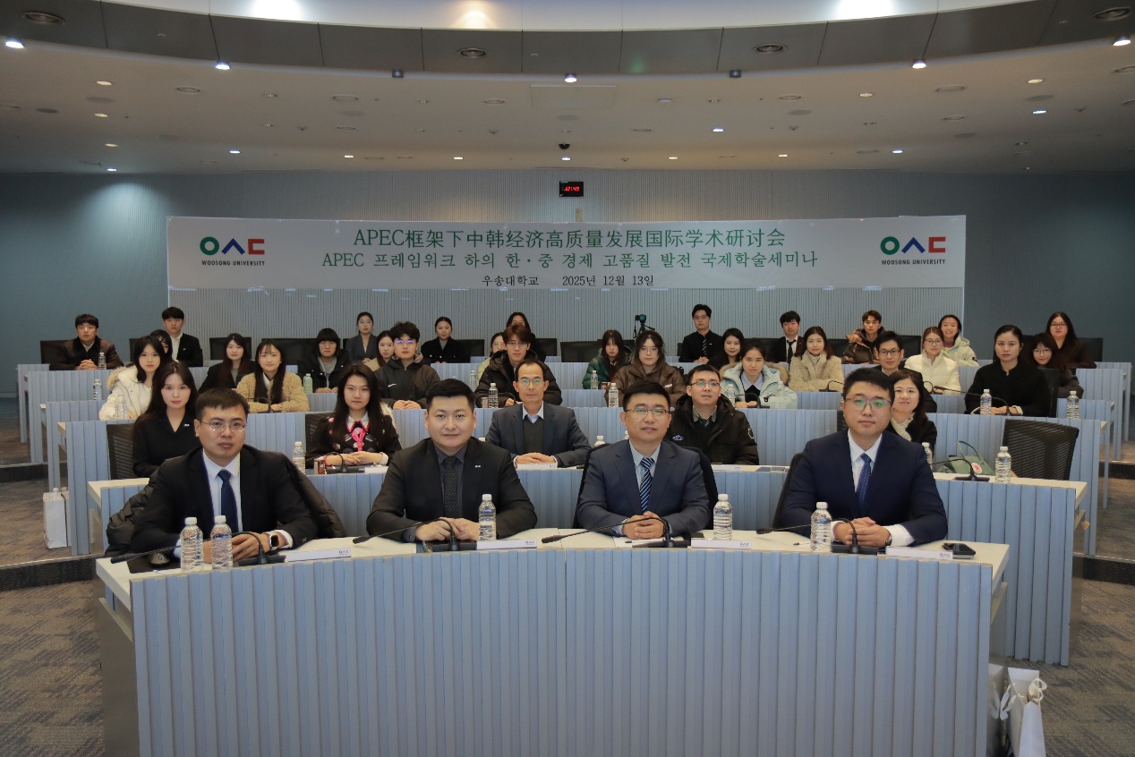 2025 年 12 月 12 日至 14 日,第一届 APEC 框架下中韩经济高质量发展国际学术研讨会在韩国大田广域市又松大学成功举办。本次会议由韩国又松大学主办,又松大学 SolBridge 国际商学院、青岛理工大学商学院联合承办,潍坊学院经济管理学院作为核心支持单位深度参与会议筹备与学术组织工作,与山东建筑大学商学院、鲁东大学商学院等多所高校携手,共同搭建了中韩经贸领域高端学术交流平台。来自中韩两国及亚太地区的专家学者、企业代表通过线上线下结合的方式齐聚一堂,围绕 “深化合作与交流 提升中韩经贸韧性” 主题,展开深入研讨与思想碰撞。
