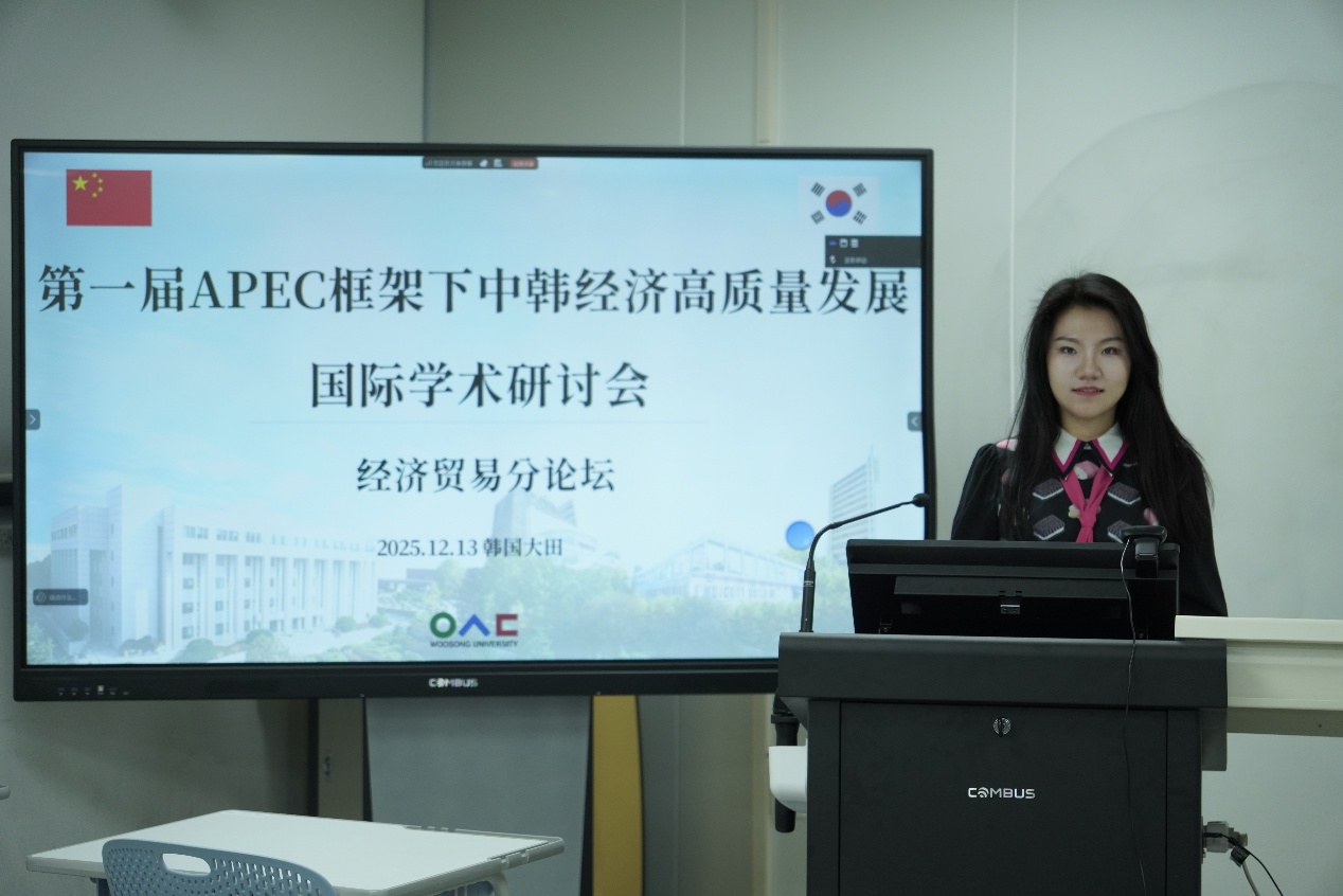 在12 月 13 日下午举办的经济贸易分论坛上,潍坊学院隋玥老师以线下形式汇报了题为《APEC 框架下中韩功效型美妆跨境电商出口竞争力提升机制研究》的论文。该研究立足中韩美妆产业贸易现状,聚焦跨境电商新业态,深入分析了 APEC 框架下两国美妆产业合作的优势与潜力,提出了提升中国功效型美妆跨境电商出口竞争力的具体路径,为推动中韩美妆产业高质量合作提供了新思路。汇报内容详实、论证严谨,引发了与会专家学者的广泛关注与热烈讨论。