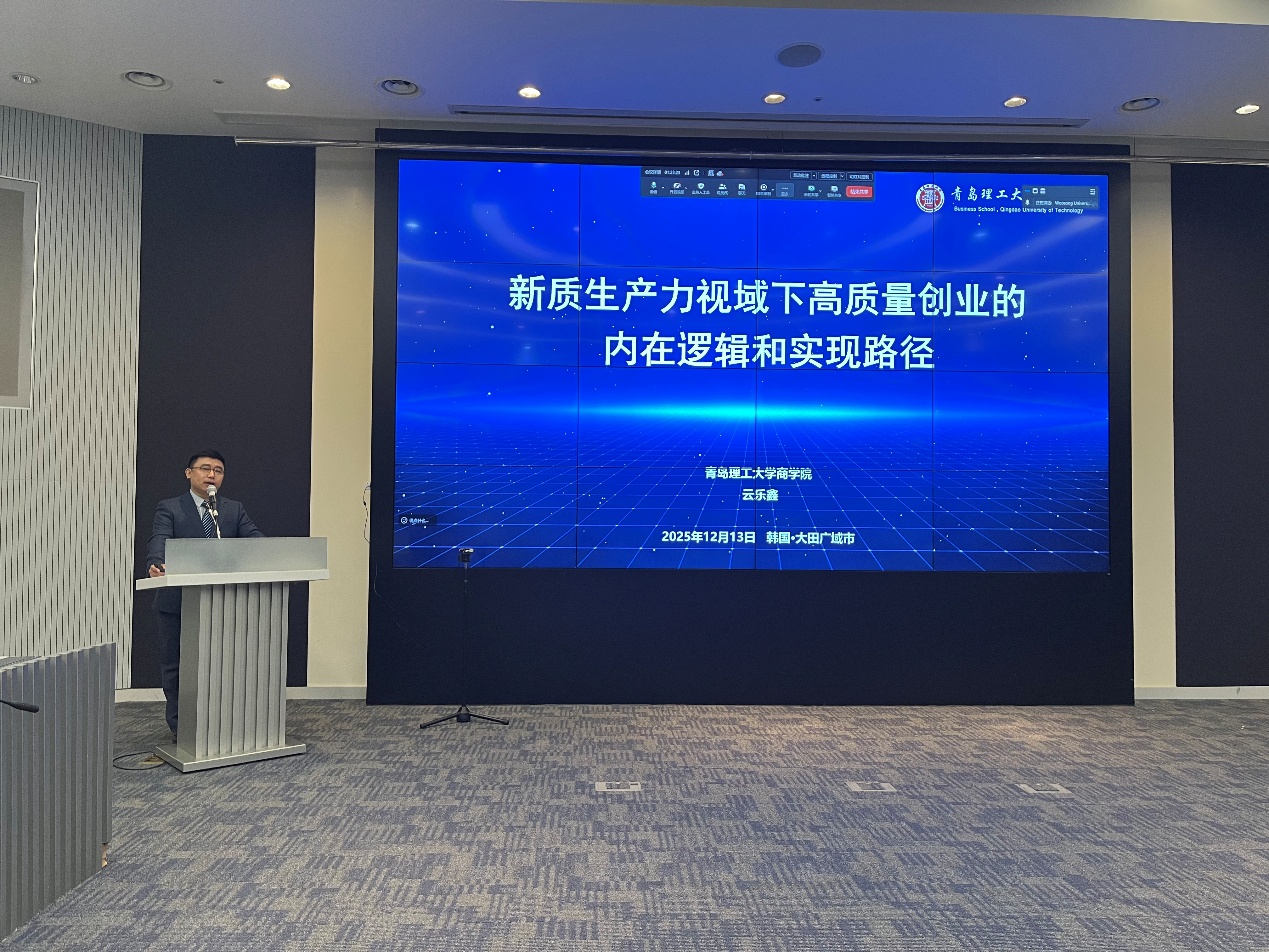会议开幕式上,青岛理工大学商学院院长云乐鑫作为联合承办单位代表致辞,他表示,中韩两国经贸往来成果丰硕,稳固的贸易伙伴关系为双边深化合作奠定了坚实基础,当前全球经济面临多重挑战,本次研讨会的举办既是对APEC 领导人非正式会议精神的积极响应,也是学界以学术创新赋能双边经济高质量发展的务实之举;青岛理工大学商学院深耕数字经济、绿色创新等前沿领域,此次与各方携手承办会议,有幸汇聚众多高质量学术成果,期待各位专家通过思想碰撞凝聚合作共识,为提升中韩经贸韧性、建设亚太命运共同体贡献智慧与力量。随后的主题演讲与主旨报告环节,主旨报告环节云乐鑫院长又以 “新质生产力视域下高质量创业的内在逻辑和实现路径” 为题分享前沿洞见,中外知名学者也围绕数字经济、产业链供应链韧性、绿色创新等前沿议题分享研究成果,引发全场共鸣。