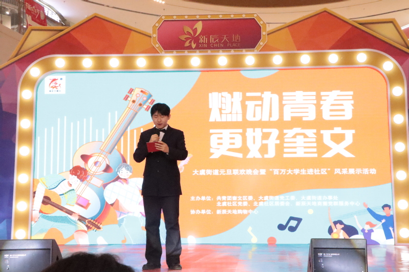 为丰富社区文化生活、营造元旦节日氛围,潍坊学院经济管理学院红星志愿服务队于12月26日,在潍坊市奎文区新辰天地购物中心参演了大虞街道元旦联欢晚会。服务队队员代表东园、孙家、北虞三个社区呈现了四个节目,与各社区携手完成晚会演出。