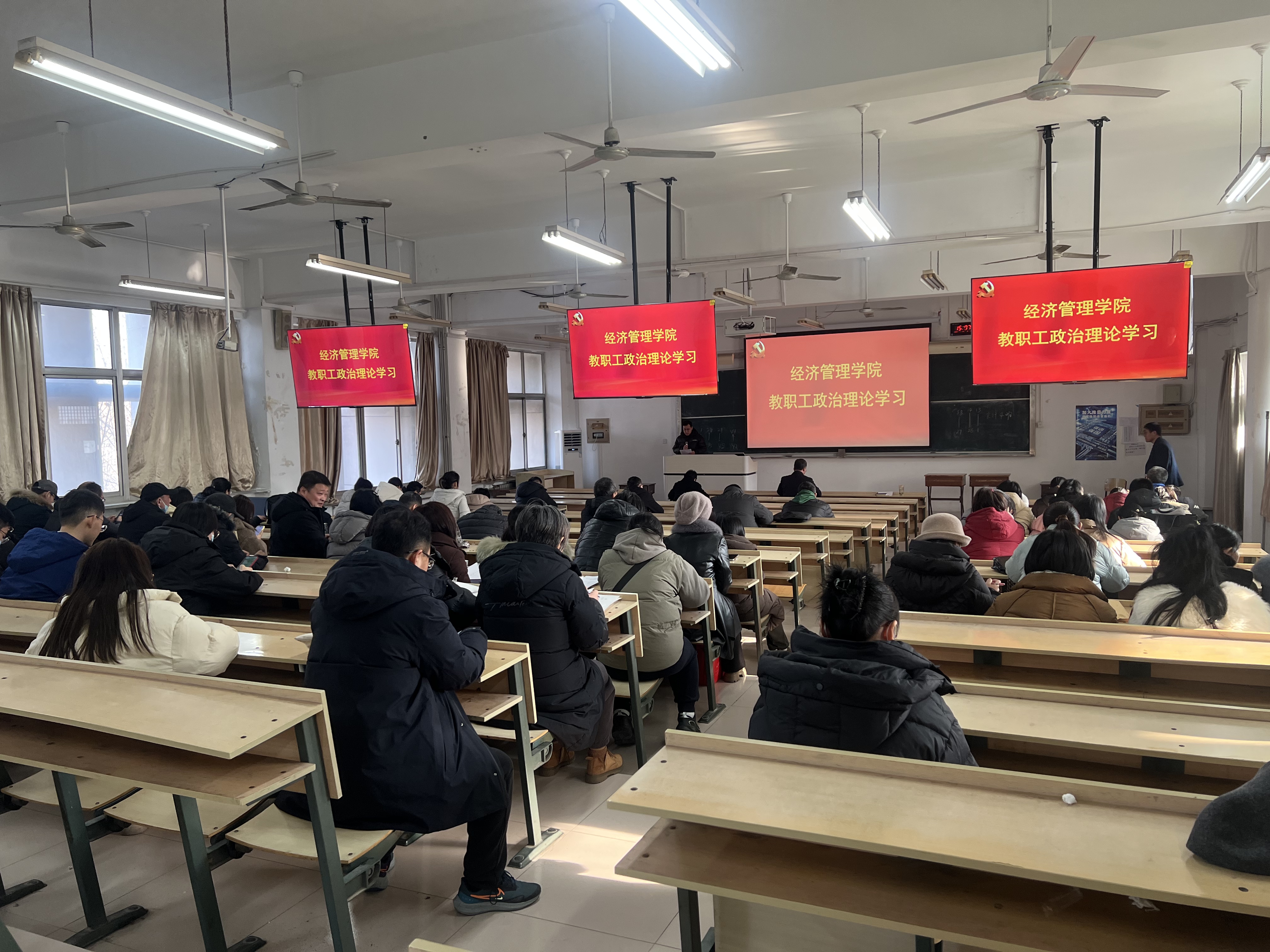 1月23日下午,经济管理学院在6412教室举行了本年度第一次全体教职工政治理论学习。本次学习由会计系孙瑜老师领学,专题学习党的二十届四中全会精神,经济管理学院全体教职工参会。