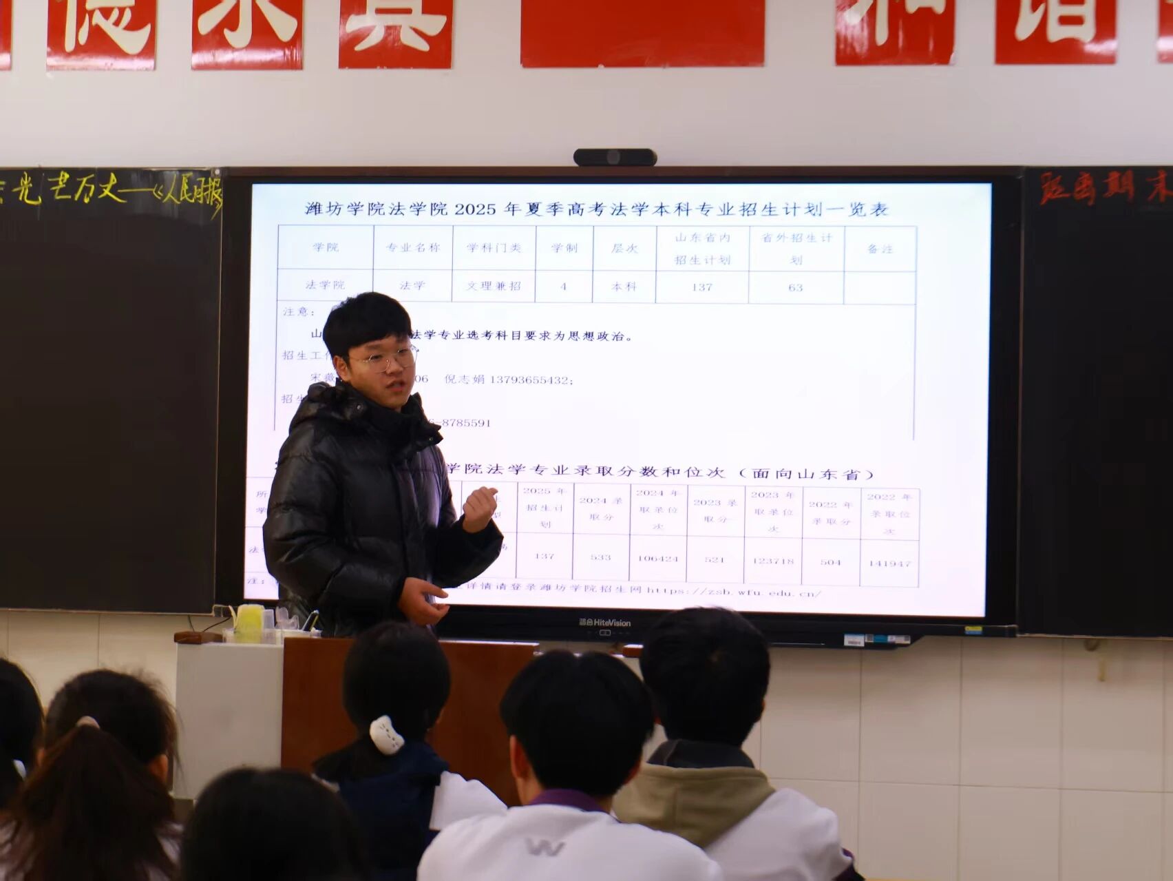 宣讲中,队员们以“潍院代言人”的身份,通过PPT展示与现场讲解,全方位介绍了校园风貌、生活环境、图书馆资源等,以亲身经历展现了学校的学术与生活氛围。针对高考报考需求,团队重点解读了招生政策,如经济管理学院新增的金融科技专业、会计学专业扩招,以及法学院法学专业的选考科目要求与录取位次等关键信息,为中学生提供了精准参考。此外,队员们还介绍了学校的实验班模式与各类实践活动。